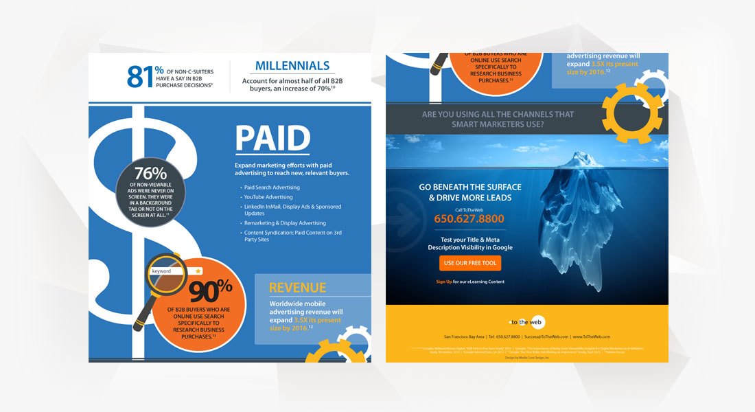 A long-time client wanted to create a stunning infographic to showcase current B2B marketing trends. We created this large graphic based on various stats found online. We utilized the client’s current style and color palette to emphasize brand recognition. The artwork was created in Illustrator to reduce file size and while maintaining optimal quality in the exported PDF.